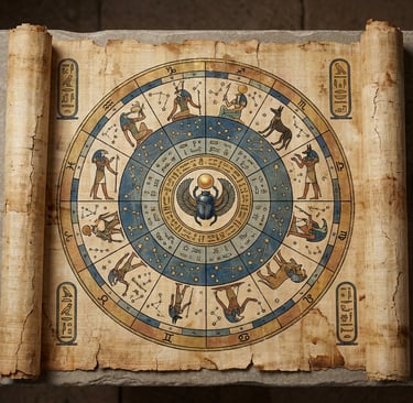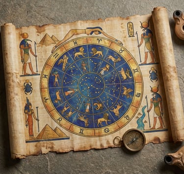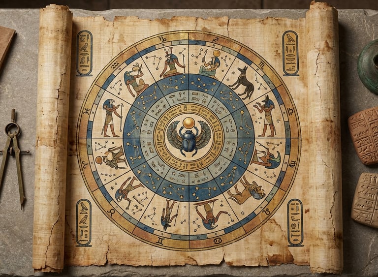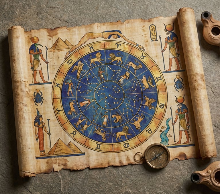 But it was the Egyptians who elevated astrology to a sacred art. Around 2000 BCE, Egyptian astronomers created detailed star charts painted on tomb ceilings and temple walls. The Dendera Zodiac, discovered in the Temple of Hathor, is one of the most famous ancient horoscope maps—a circular ceiling relief showing the 12 zodiac signs alongside Egyptian deities.